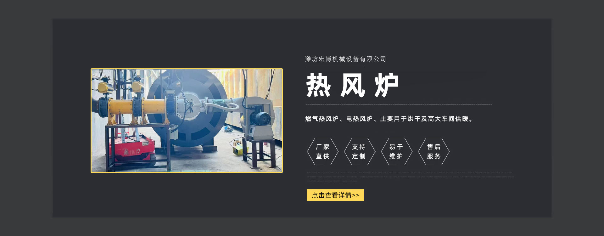 濰坊宏博機(jī)械設(shè)備有限公司是從事熱風(fēng)爐、烘干設(shè)備、供暖設(shè)備的研發(fā)(fā)、設(shè)計(jì)、制造和服務(wù)于一體的實(shí)體企業(yè)(yè)。長(zhǎng)期以來,企業(yè)(yè)以市場(chǎng)的發(fā)(fā)展和客戶的需求為導(dǎo)向,集多年的生產(chǎn)(chǎn)技術(shù)與經(jīng)(jīng)驗(yàn)為一體,不斷開發(fā)(fā)和優(yōu)(yōu)良產(chǎn)(chǎn)品。